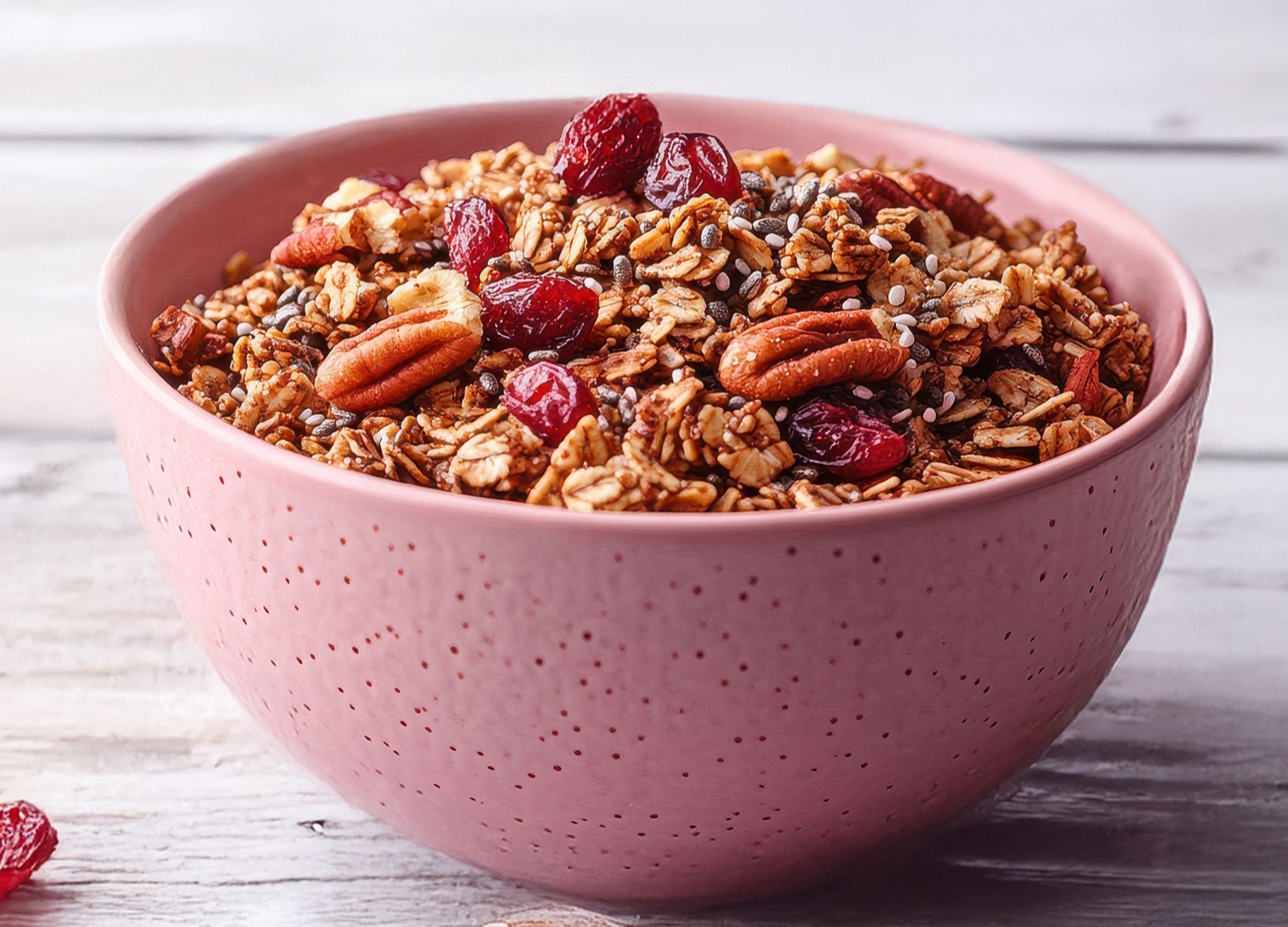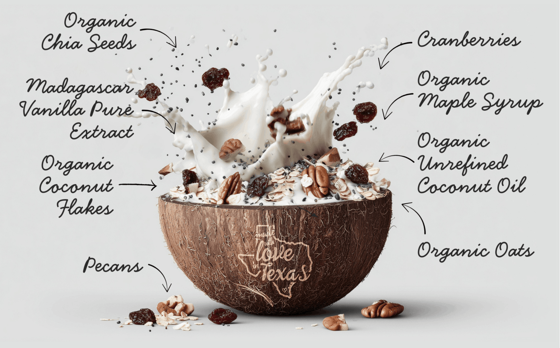 Packed with organic oats, coconut flakes, pecans, cranberries, chia seeds, and pure Madagascar vanilla, this wholesome granola fuels your day with fiber, heart-healthy fats, and natural antioxidants. Sweetened with organic maple syrup and bound with unrefined coconut oil, it provides clean, sustained energy without refined sugars. Deliciously energizing, clean, and nourishing in every bite.